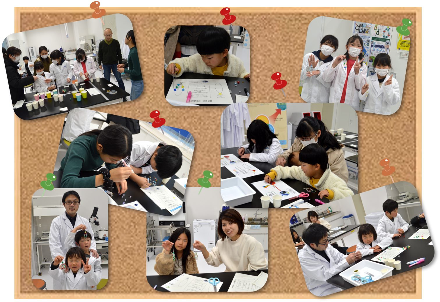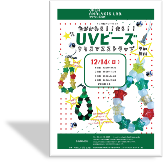 今回は、紫外線を当てると色が変わるUVビーズを使って、光の特性(物質の光の吸収と放射)を分析したよ✨ キラキラのUVビーズで、自分だけのクリスマスストラップを作ったよ🎄 白衣姿の皆さんは、研究者みたいでかっこよかったね👍