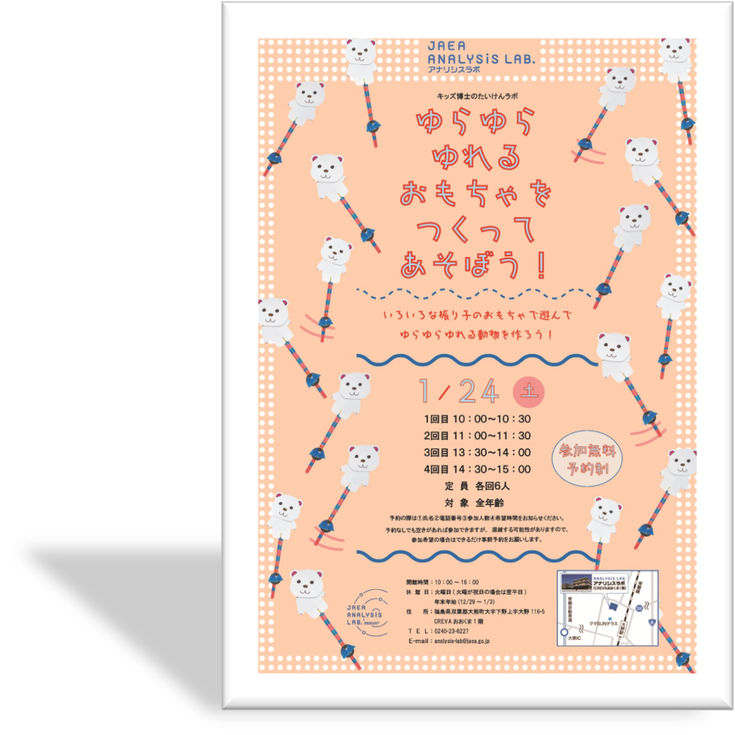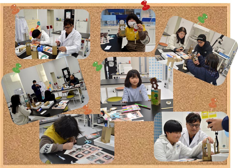 今回は、いろいろな振り子のおもちゃで遊んで振り子ごとのゆれる周期を分析したよ✨ そのしくみをつかって、ゆらゆら揺れるオリジナルのかわいい動物たちを作ったよ🐼 白衣姿の皆さんは、研究者みたいでかっこよかったね👍