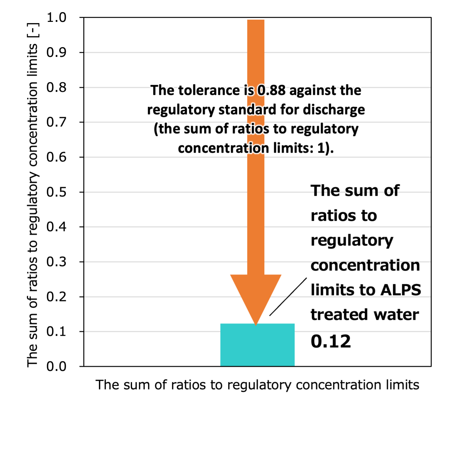 As a result of the analysis of ALPS treated water before seawater dillution, the sum of ratios of legally required activity concentrations of radionuclides other than tritium (29 nuclides [Ref.]) was confirmed to be satisfy regulatory limit (less than 1).