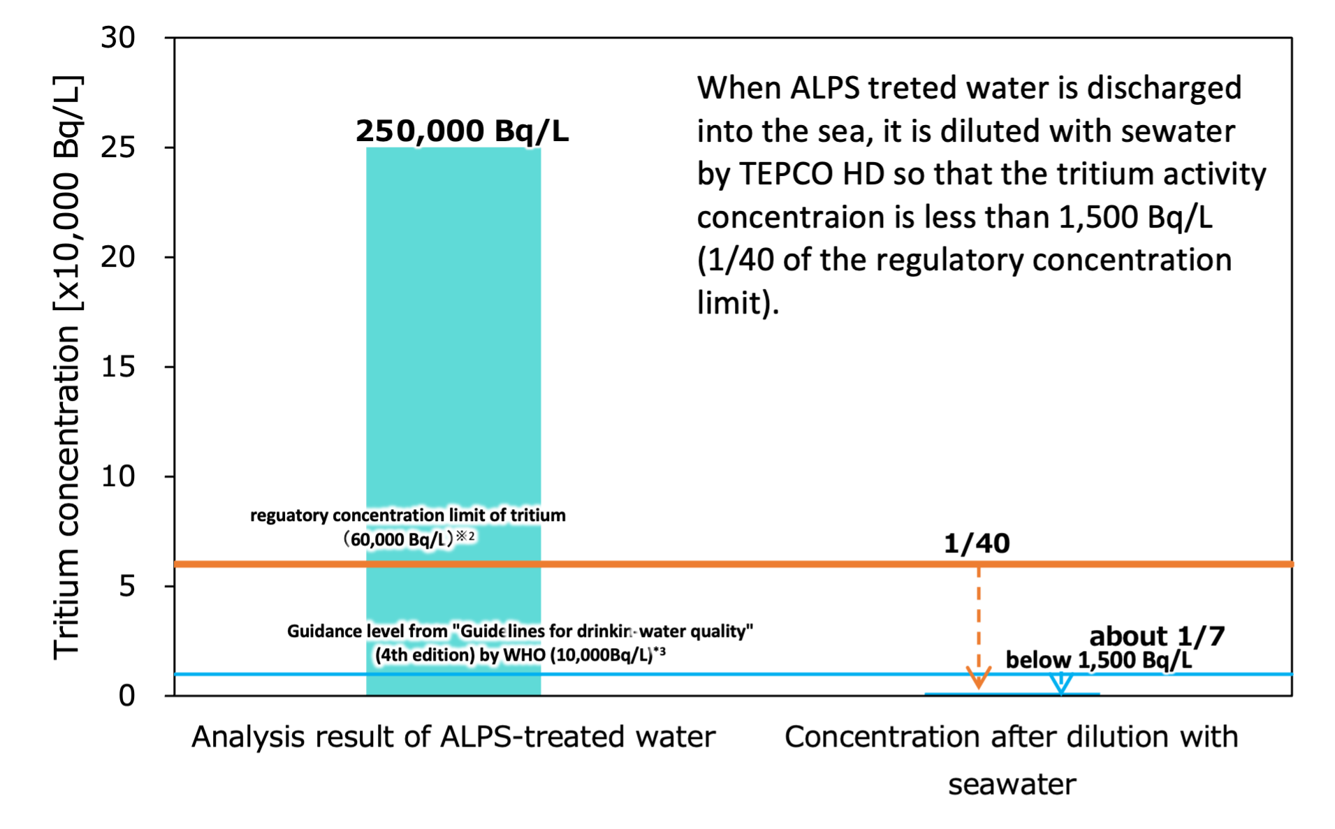 When ALPS treated water is discharge into the sea, it is dilluted with seawater by TEPCO HD so that the tritum activity concentration is less than 1,500 Bq/L (1/40 of regulatory concentration limit).