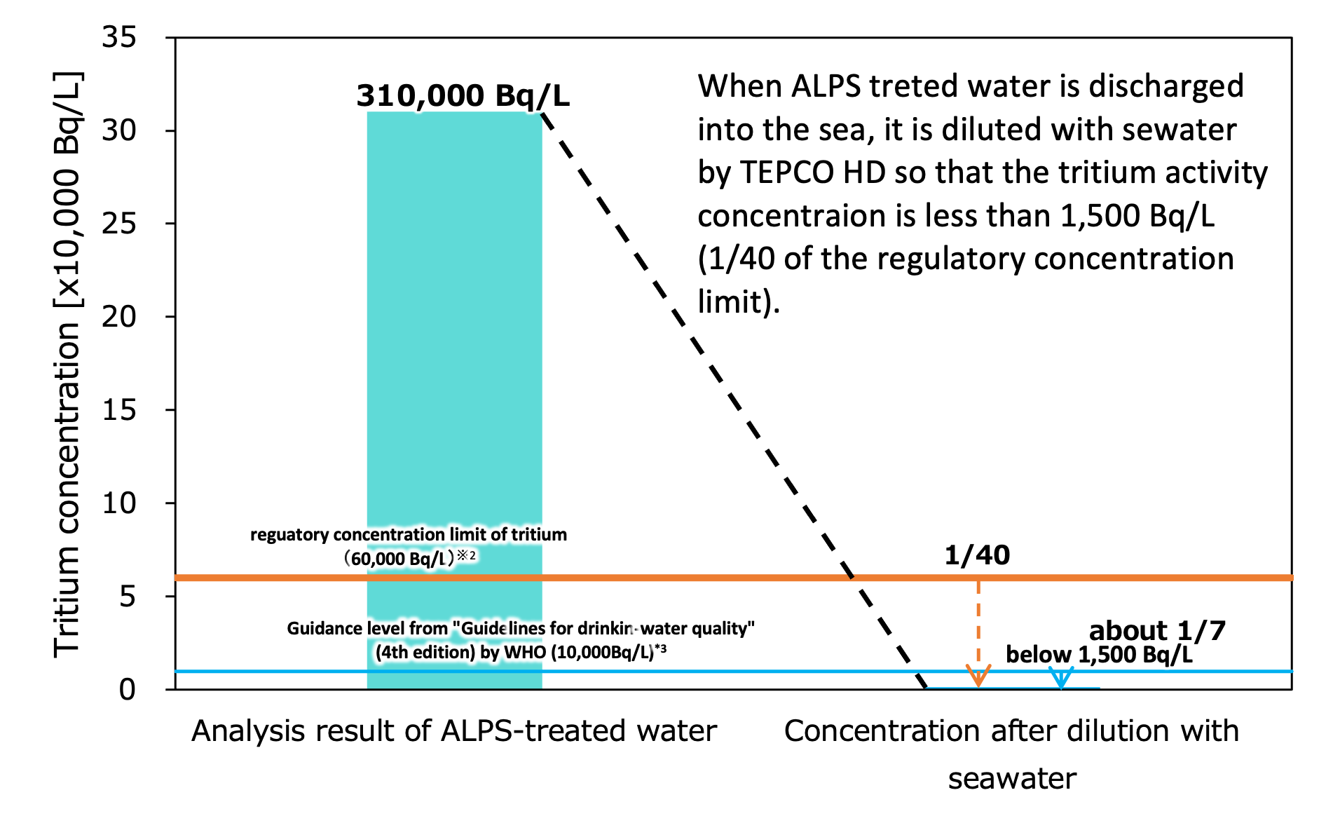 When ALPS treated water is discharge into the sea, it is dilluted with seawater by TEPCO HD so that the tritum activity concentration is less than 1,500 Bq/L (1/40 of regulatory concentration limit).