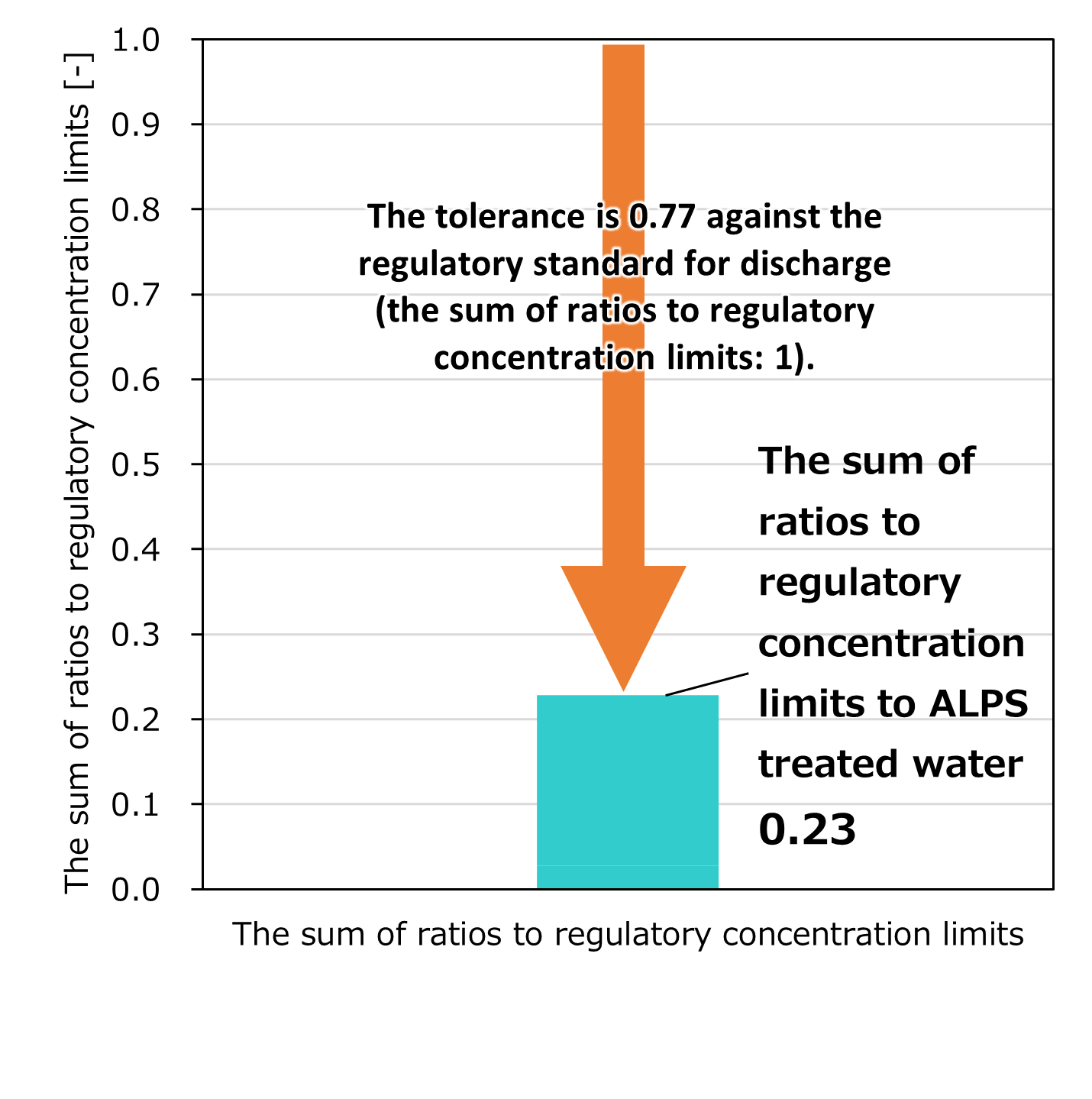 As a result of the analysis of ALPS treated water before seawater dillution, the sum of ratios of legally required activity concentrations of radionuclides other than tritium (29 nuclides [Ref.]) was confirmed to be satisfy regulatory limit (less than 1).