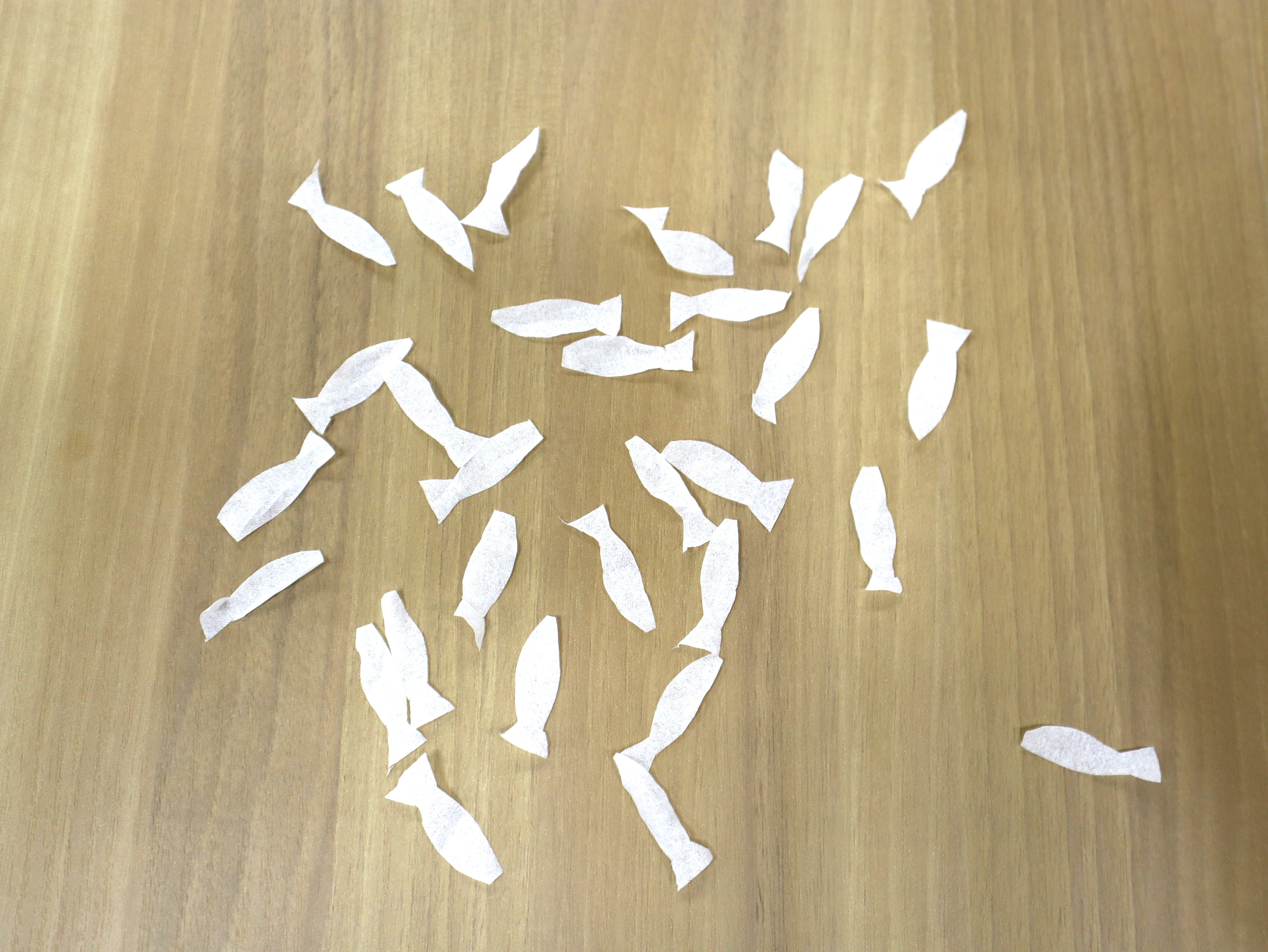 ②魚の形に切ったティッシュが、重ならないように広げる。