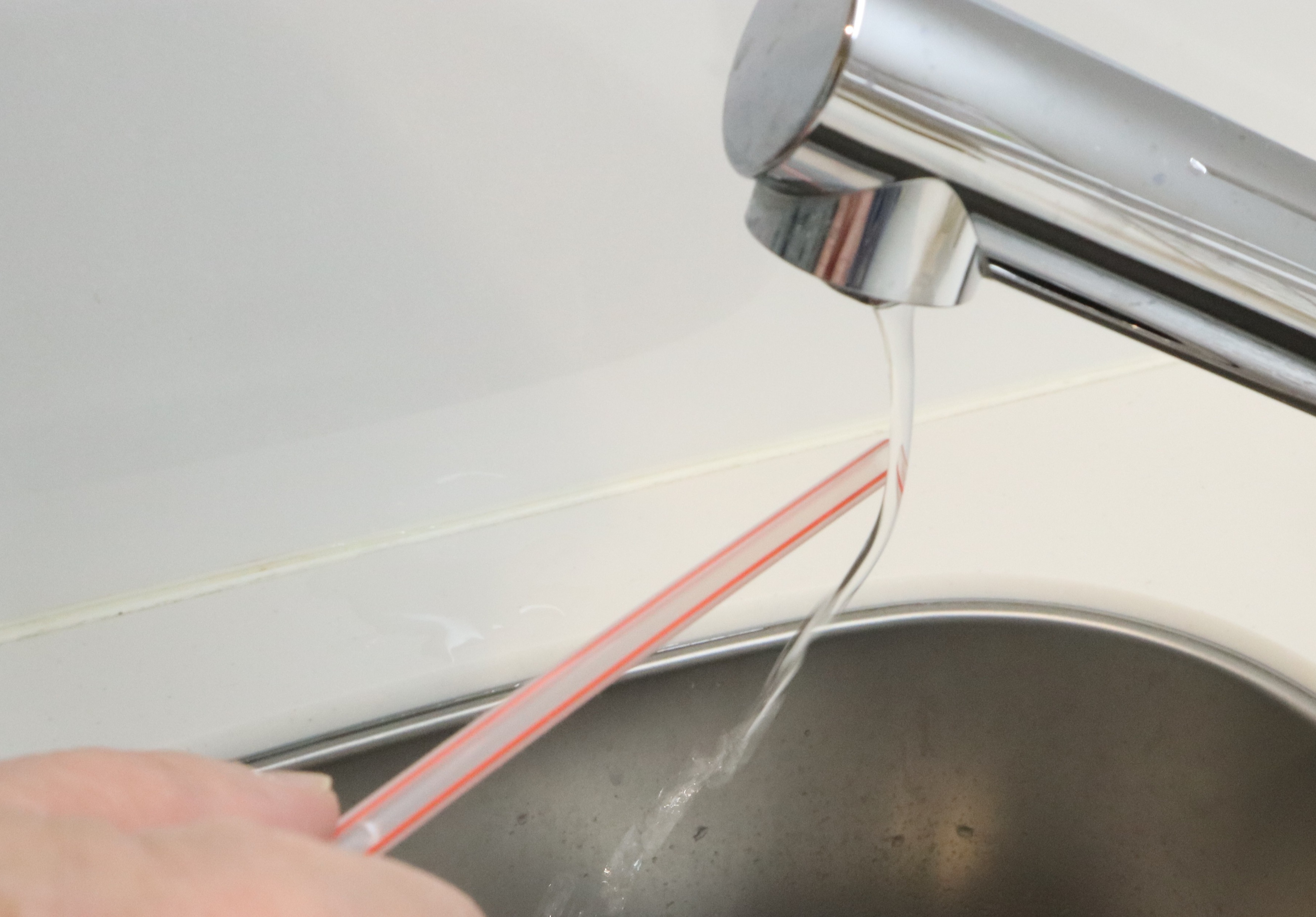 ②水道の蛇口(じゃぐち)の水を細く出し、ストローを近づける。