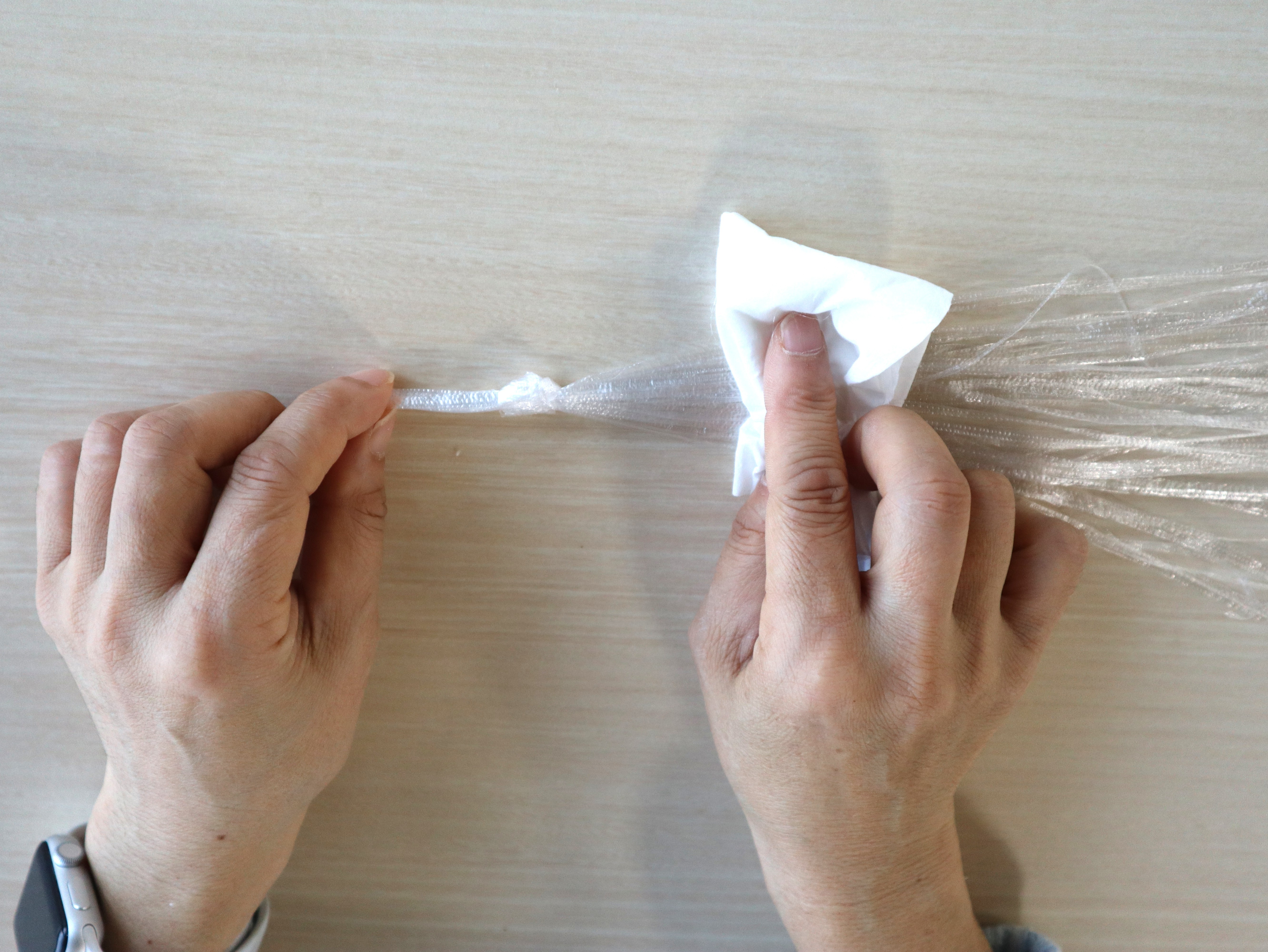 ④軽くまるめたティッシュペーパーで、ひもの足の部分を結び目から足の方向に、力を入れて20回くらいこする。
