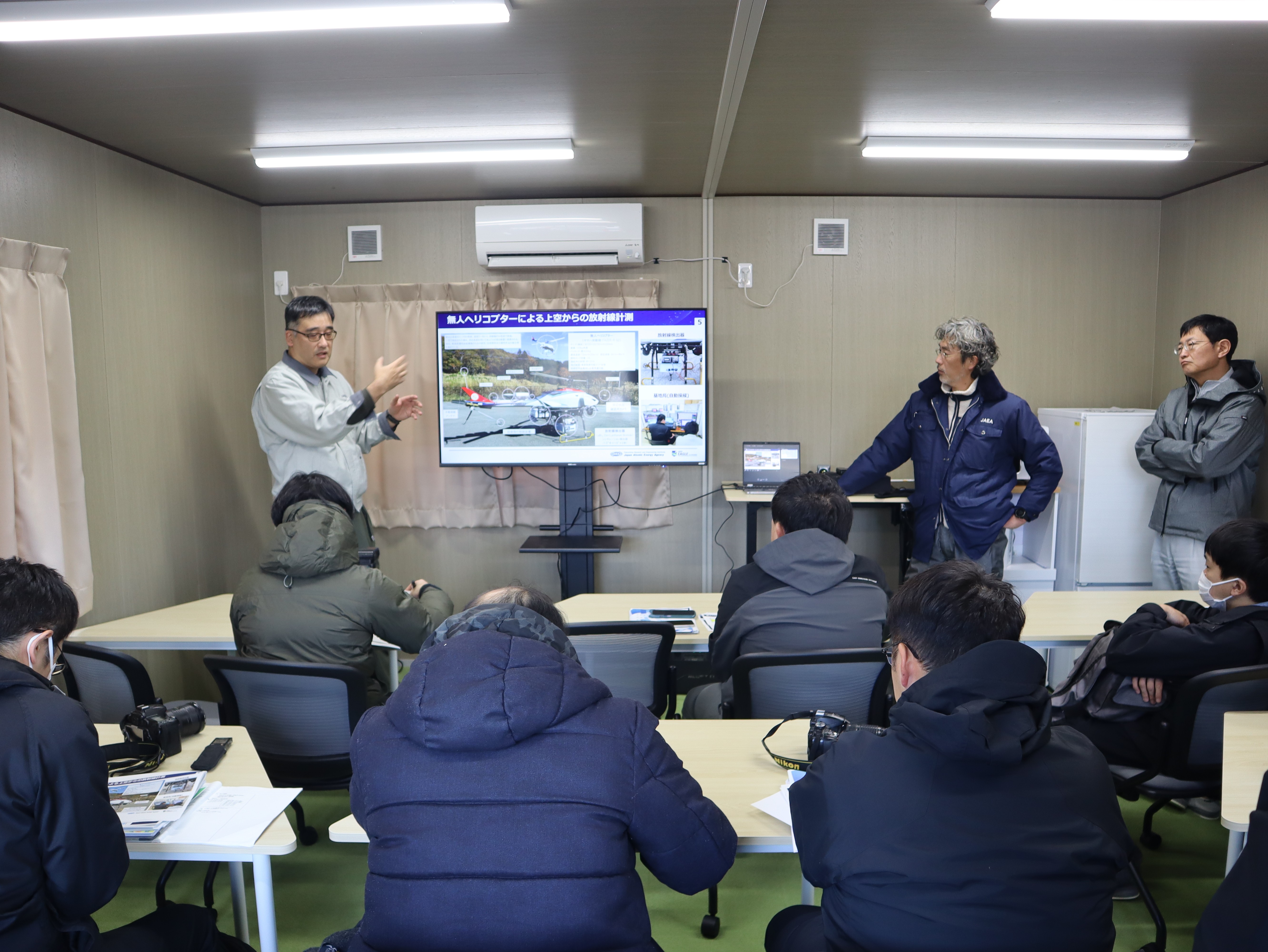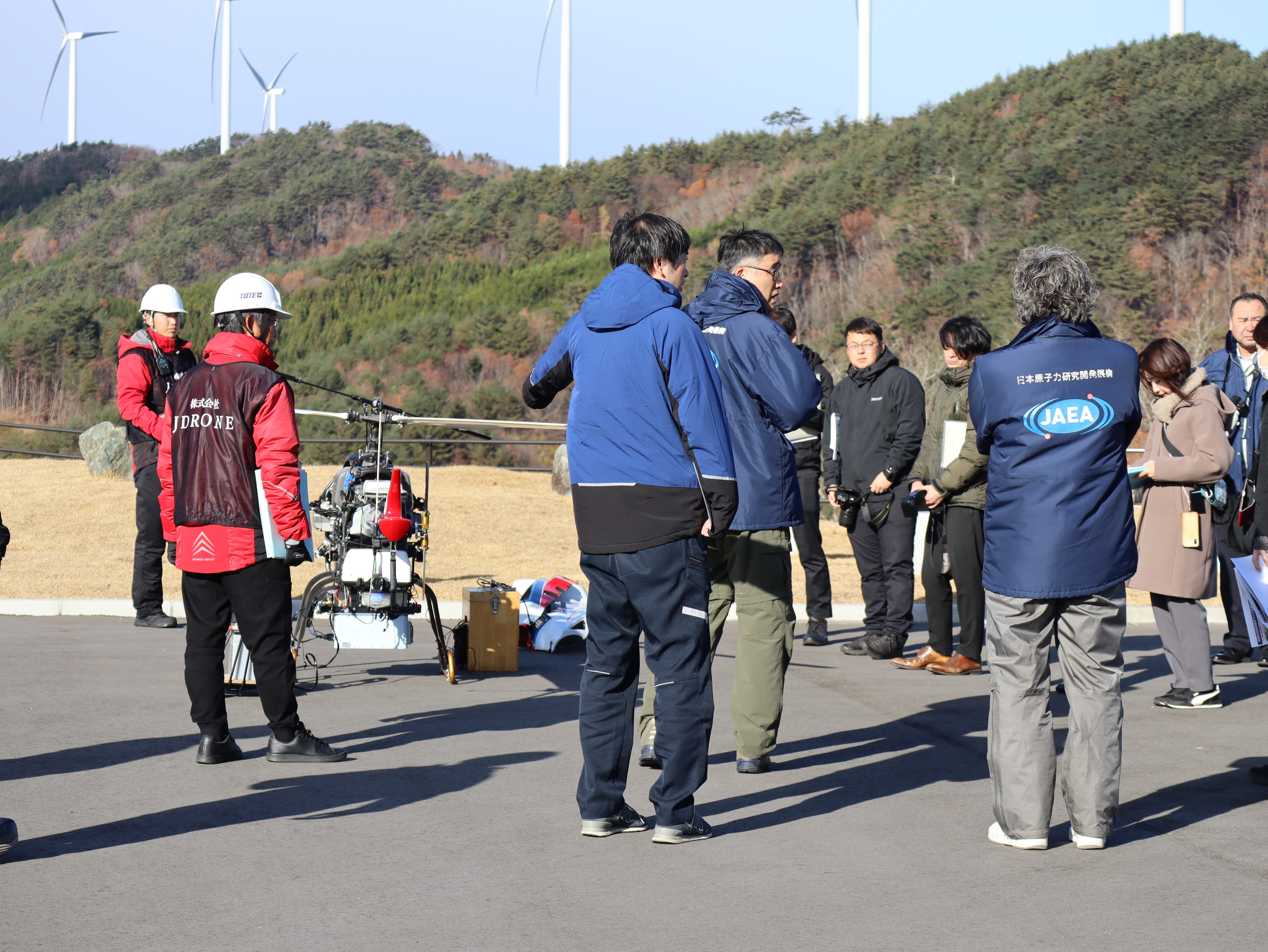 2.実証試験公開の様子 ◆概要説明と現場確認 当日は、まず山地の森林の環境モニタリングの概要、実証試験の実施場所である阿武隈風力発電所の紹介、および地域連携の取組について説明しました。その後、衛星通信機や放射線検出器を搭載した無人ヘリコプターによる放射線モニタリングのデモフライトを実施しました。