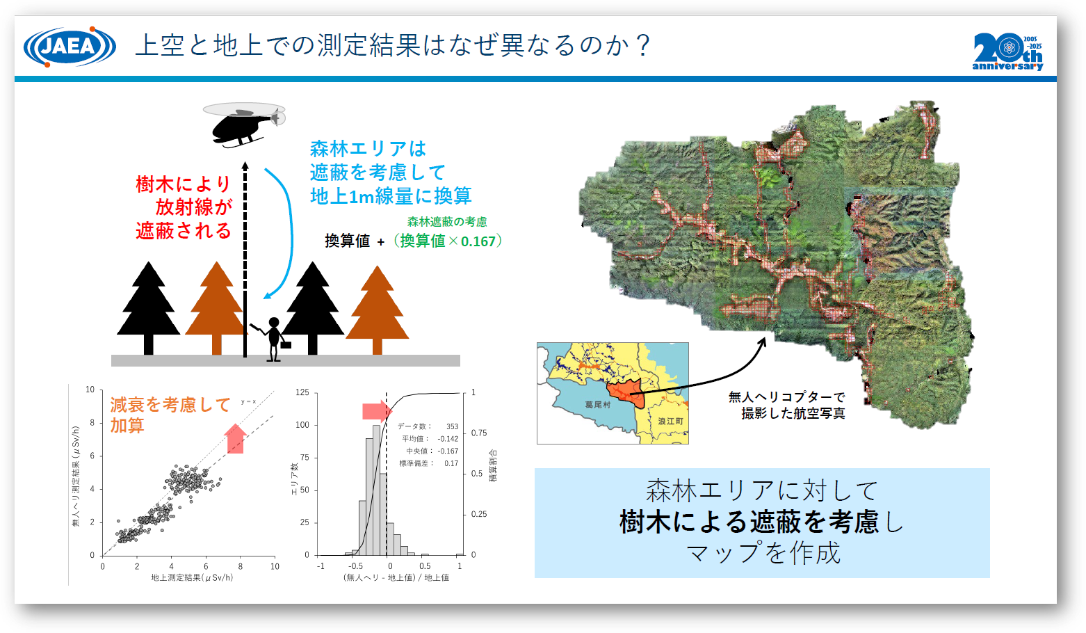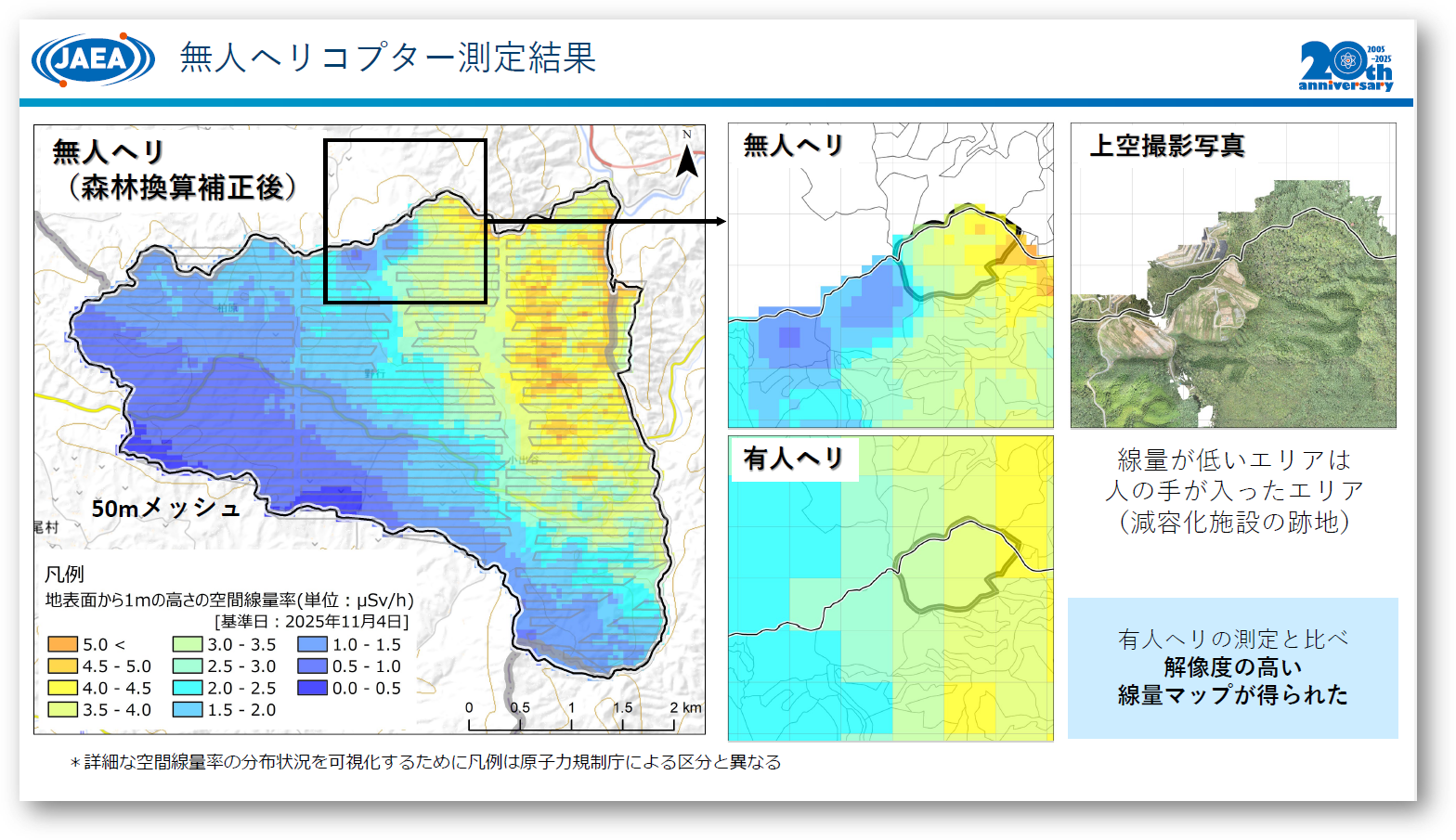 ※画像をクリックすると拡大されます。 上空と地上の測定結果を照合する。 ・上空:広い範囲を効率よく把握できる。 ・地上:局所的ではあるが高い精度で測定できる。 ↓ 山地森林の空間線量率を高精度に把握することで、今後の避難指示解除の判断や森林の利活用計画の基礎データとして活用できます。 今回、福島県葛尾村で実施した実証試験では、「上空からの広域的な計測」と「地上での詳細な計測」を組み合わせることで、森林における空間線量率の分布をより正確に把握できる手法を示しました。