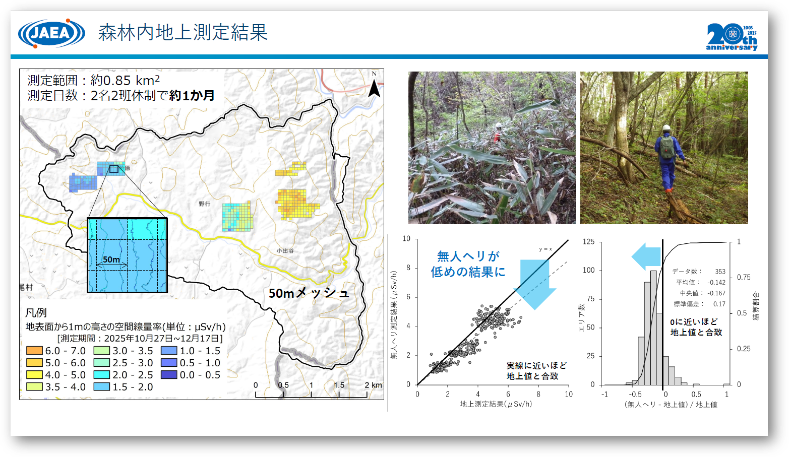 1.実証試験の実施 福島廃炉安全工学研究所では、2011年の福島第一原子力発電所事故以降、飛散した放射性物質の状況を把握するため、放射線のモニタリング(測定・観測)を継続的に行っています。これまで生活圏を中心に除染などの線量を下げる取組が進められてきました。その結果、避難指示は段階的に解除され、住民の帰還や生活環境の再建が少しずつ進んでいます。一方で、帰還困難区域の多くを占める森林や山間部では、いまだ避難指示解除の見通しが立っていません。